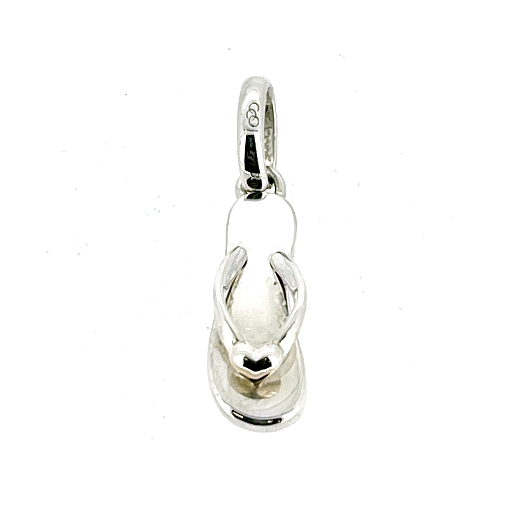 This engraved version is believed to have appeared towards the end of the brand’s trading years — likely the late 2010s. The missing date letter is consistent with the final production runs when Links of London was simplifying its hallmarks before liquidation. While standard flip flop charms appear on the market occasionally, this engraved wording version is far rarer and especially desirable when the tiny heart detail still shows its original plating, however faint.