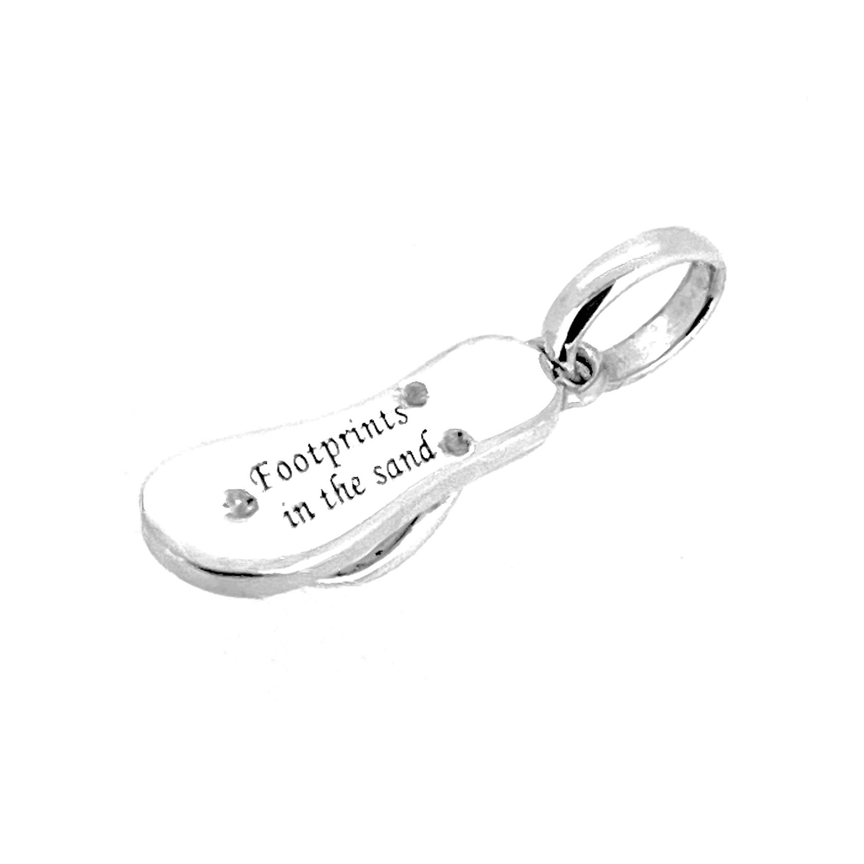 This charm is crafted in solid 925 sterling silver and takes the form of a tiny summer sandal. On this particular version, the sole is inscribed with the full wording “Footprints in the Sand” — an unusual engraved variant that sets it apart from the more common footprint pattern versions.