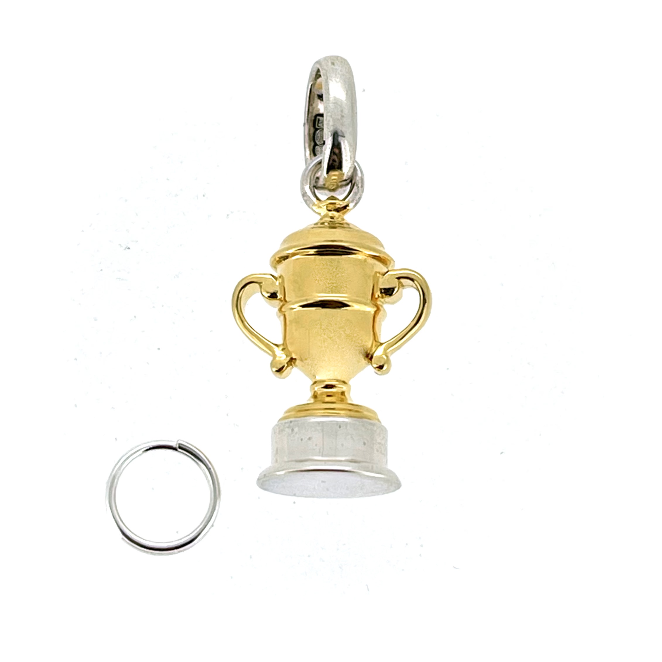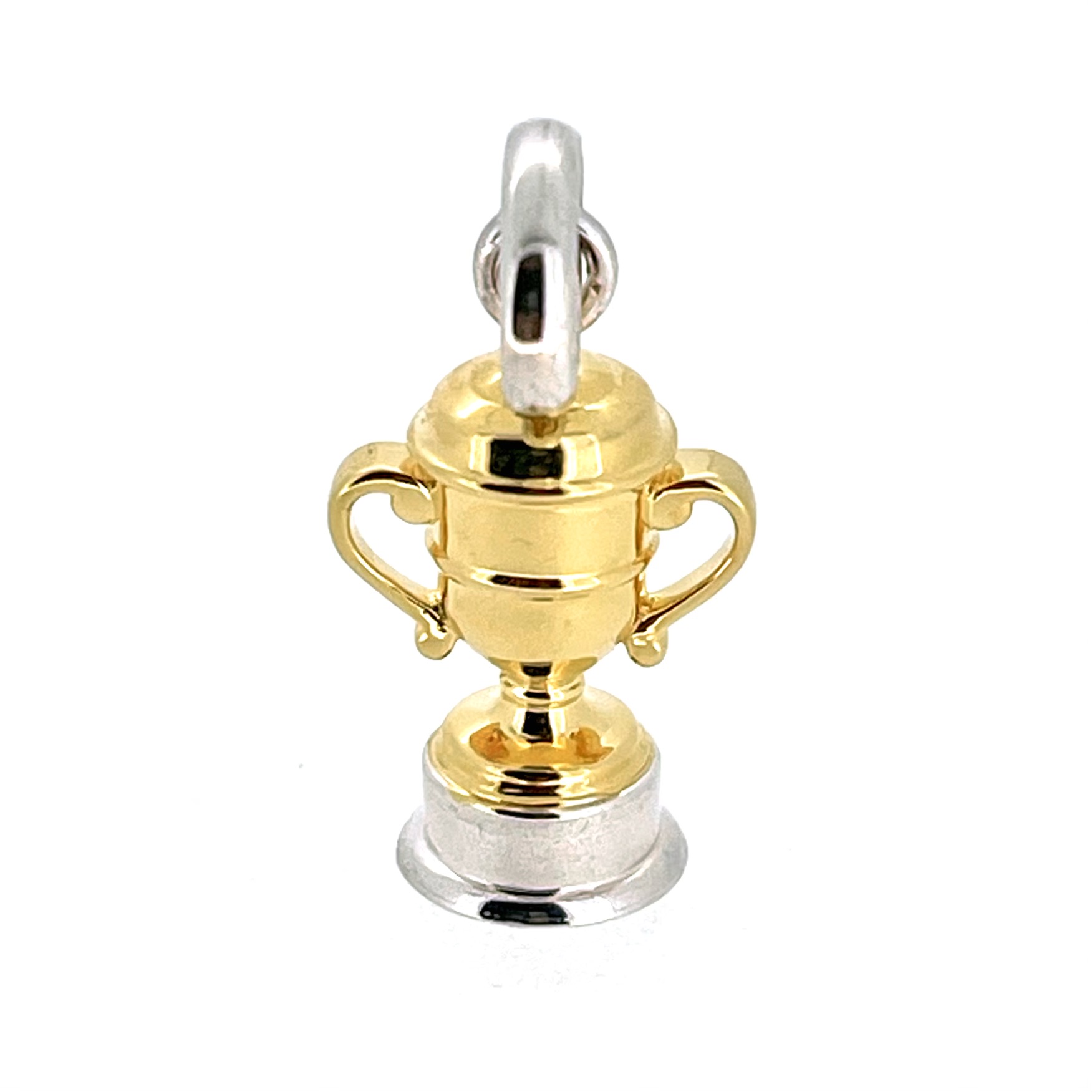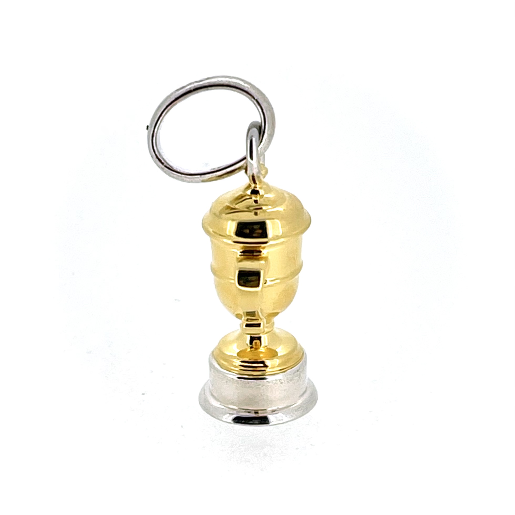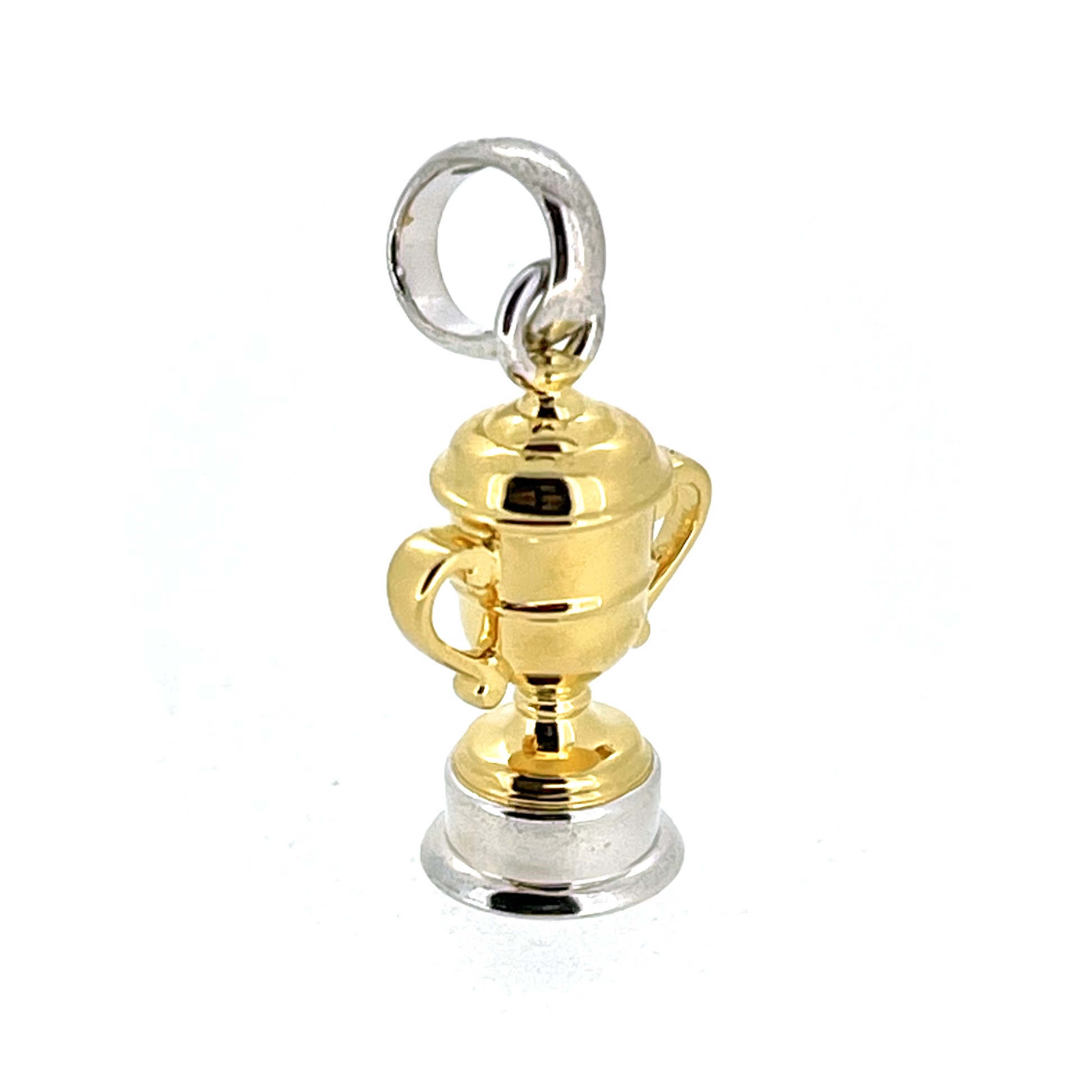 The trophy cup itself is finished in bright gold vermeil, contrasted by a solid sterling silver base and bail. This two-tone design adds depth and versatility, making it a sophisticated addition to any necklace or charm bracelet.