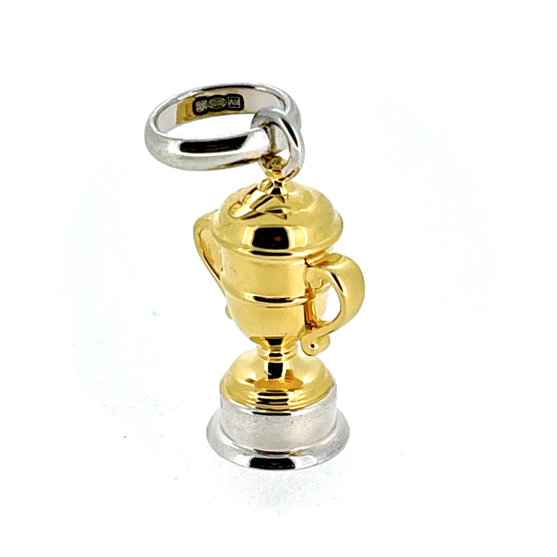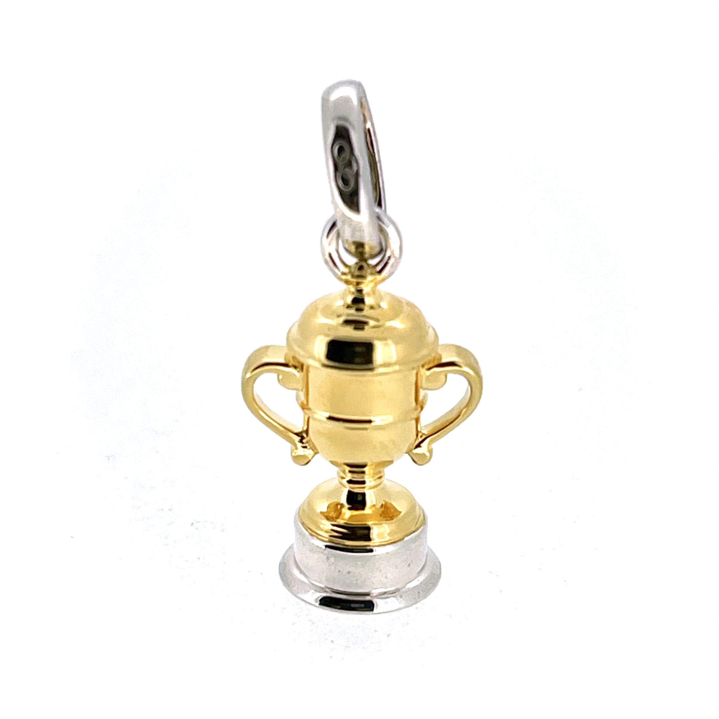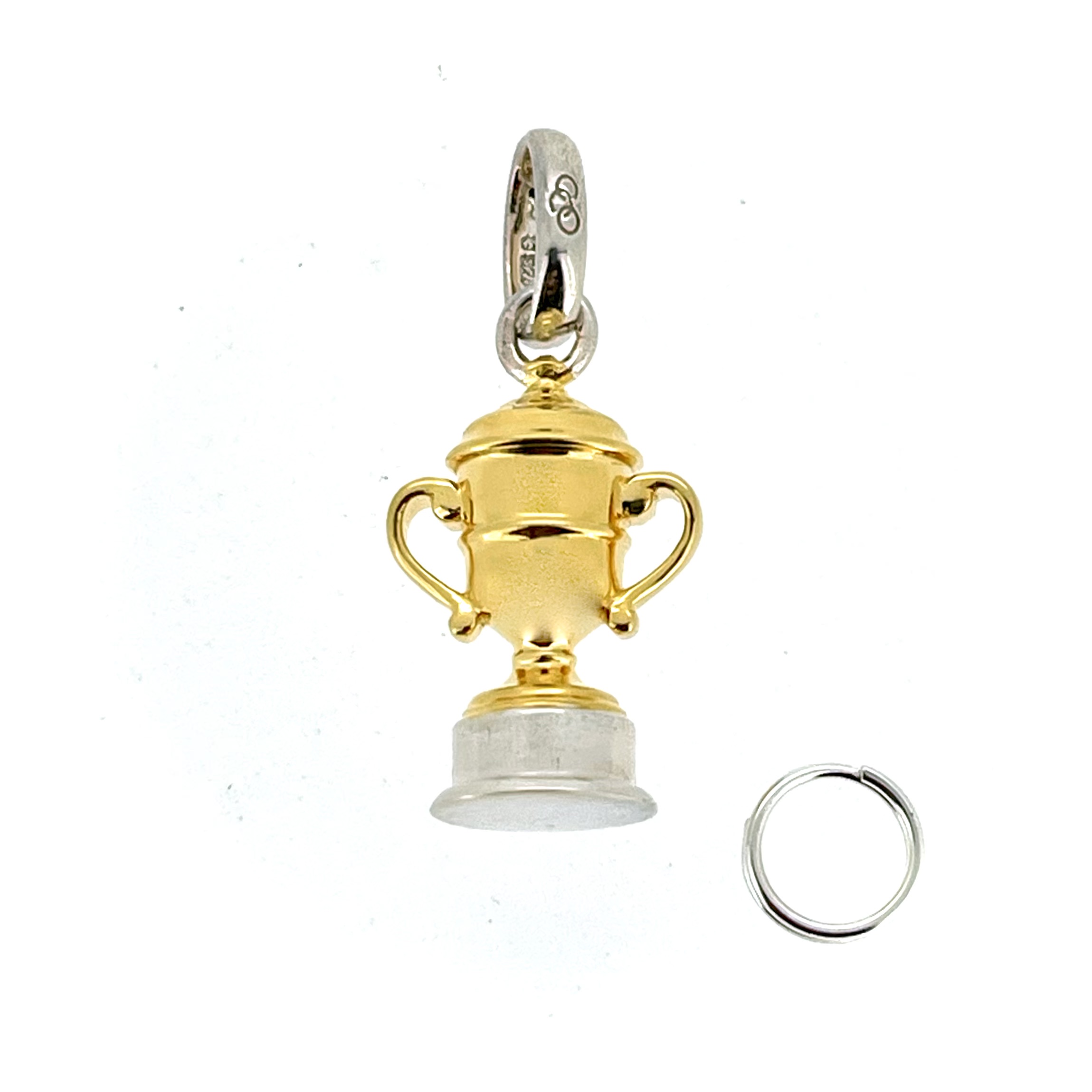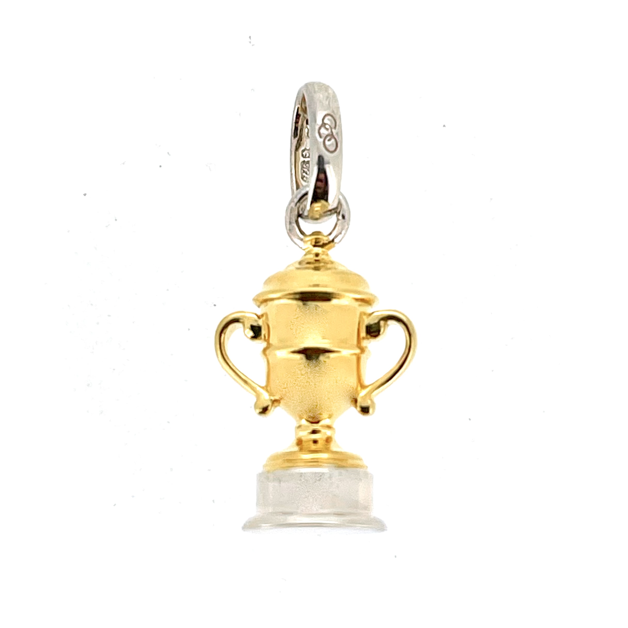 The trophy cup itself is finished in bright gold vermeil, contrasted by a solid sterling silver base and bail. This two-tone design adds depth and versatility, making it a sophisticated addition to any necklace or charm bracelet.