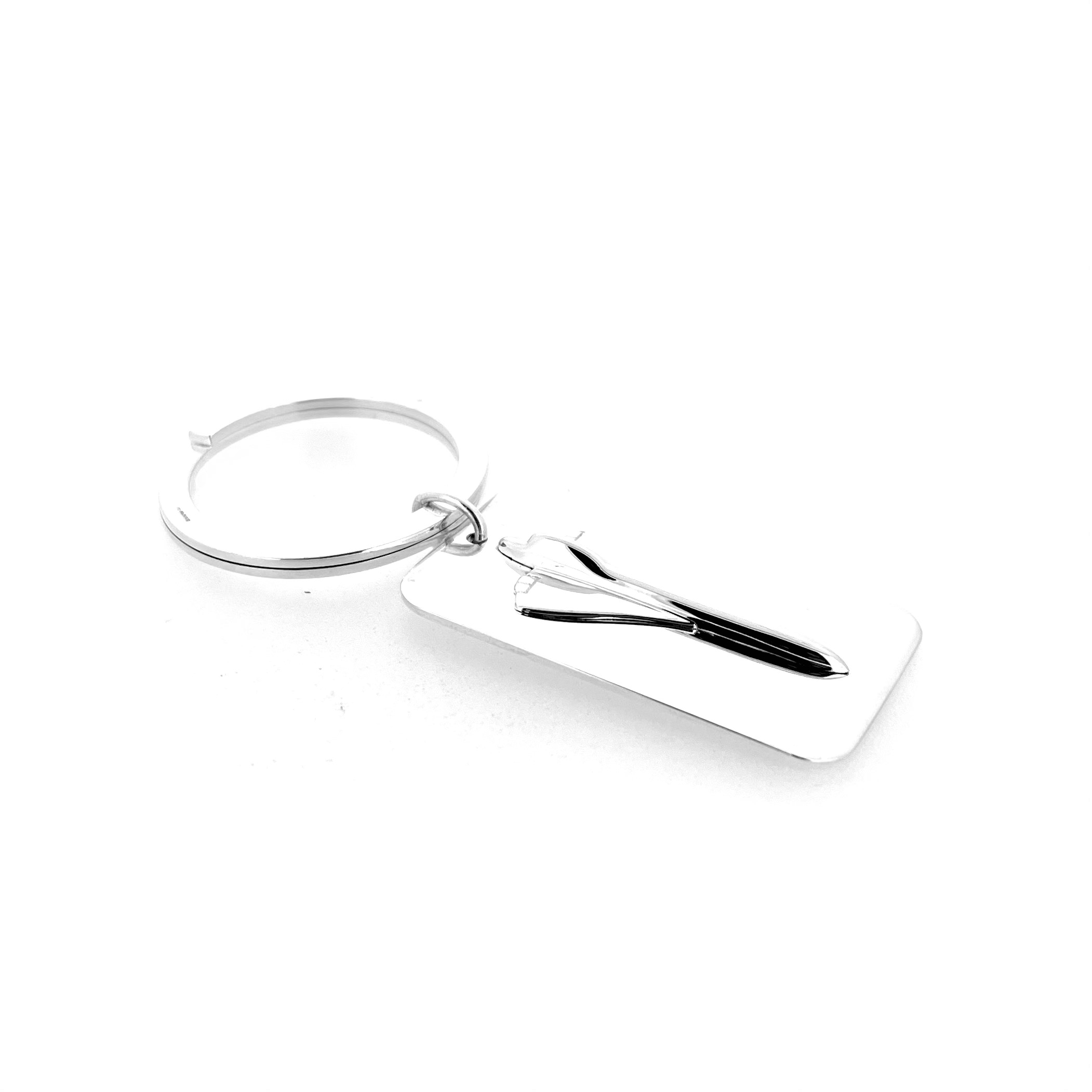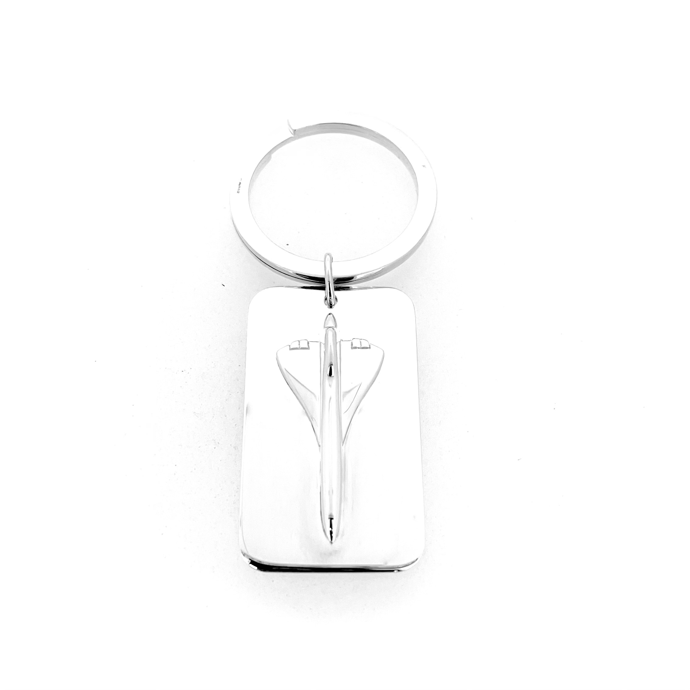The Concorde fob is fully three-dimensional, with carefully contoured wings and nose that mirror the aircraft’s distinctive delta shape. Cast in sterling silver and hand-polished to a bright finish, it hangs from a classic 35mm split ring hallmarked “LL 925” with a 2003 date letter — a detail confirming its authenticity and period of production.