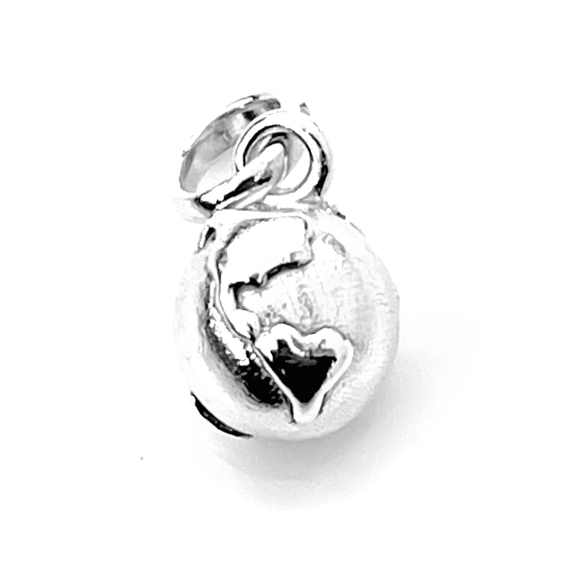 - Description: A solid charm crafted entirely from sterling silver, featuring an embossed relief of the Earth’s continents.