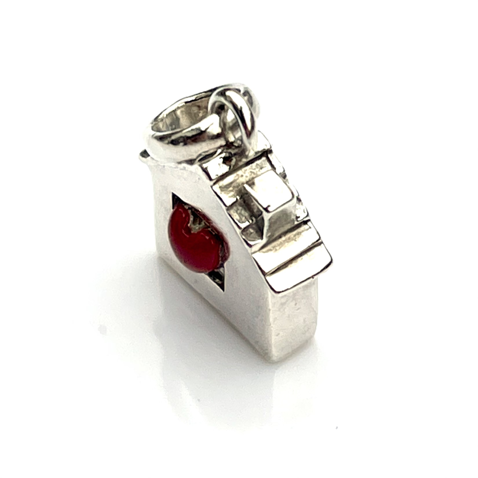 - Design: A sterling silver house with clean lines and a vibrant red enamel heart on the front.