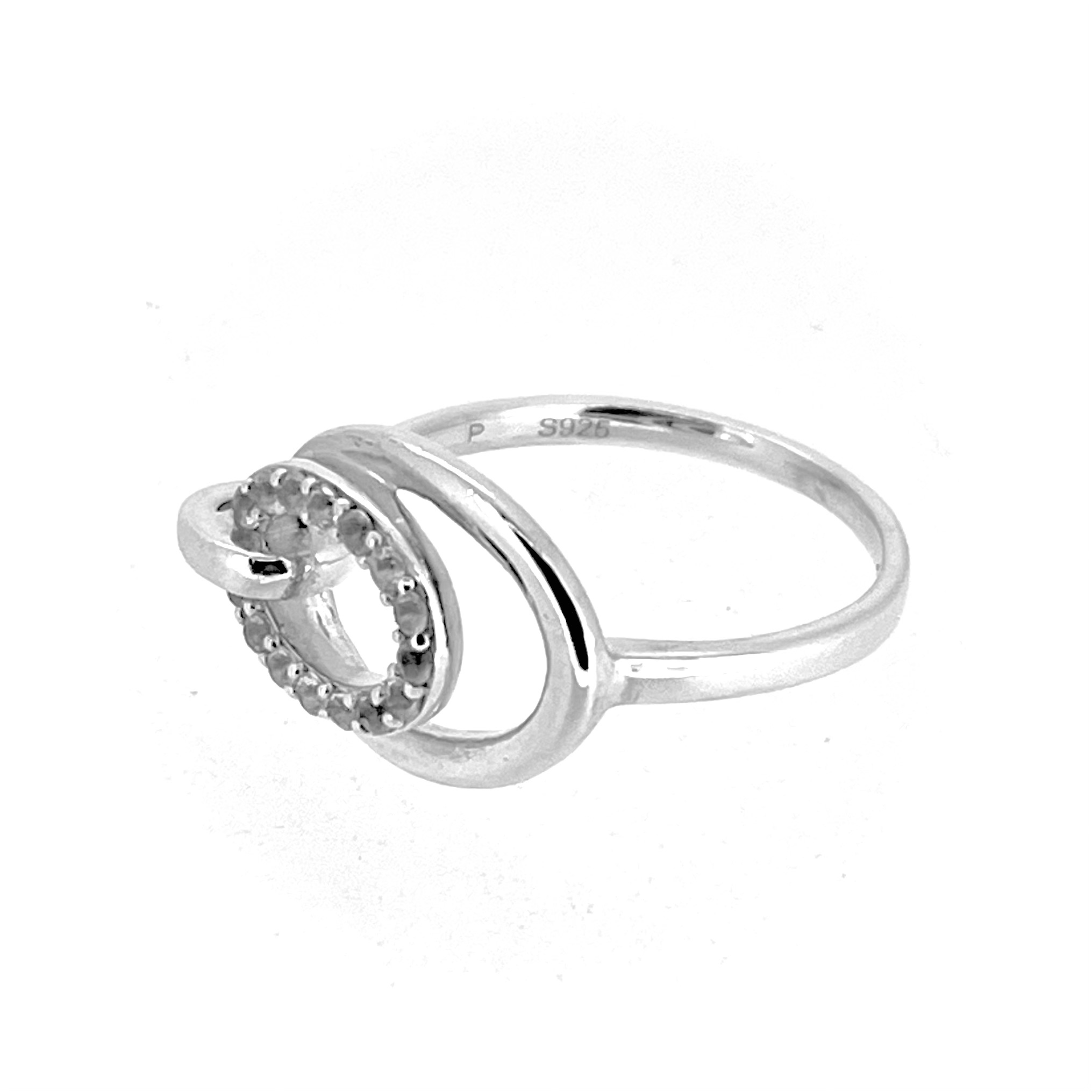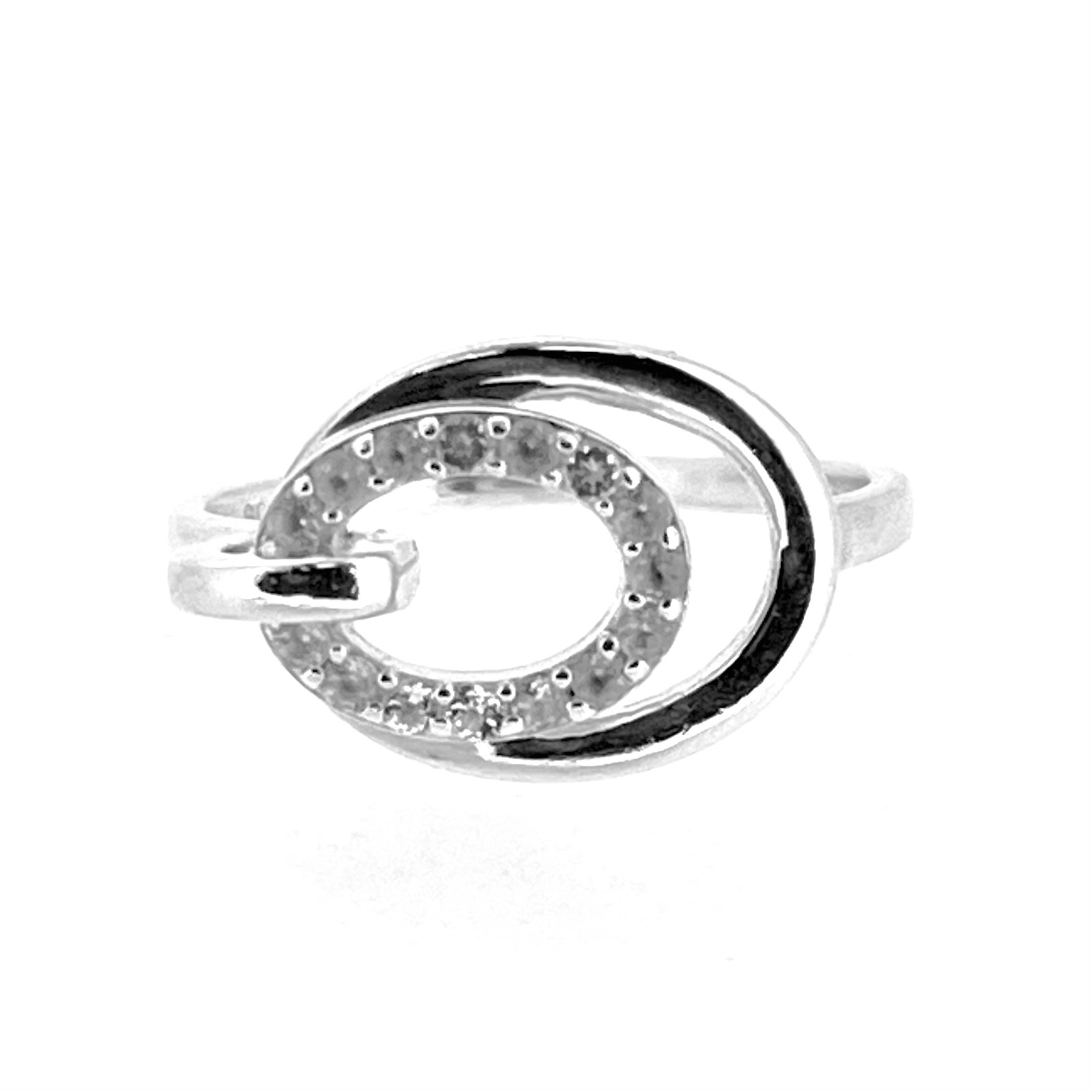 The ring’s focal point is its twin ovals: a larger polished silver oval (15mm x 11mm) and a smaller elevated oval (11mm x 8mm) adorned with 15 round-cut cubic zirconia (CZ) stones. The smaller oval is attached at one end by a subtle oval connector, creating a layered, dimensional effect.