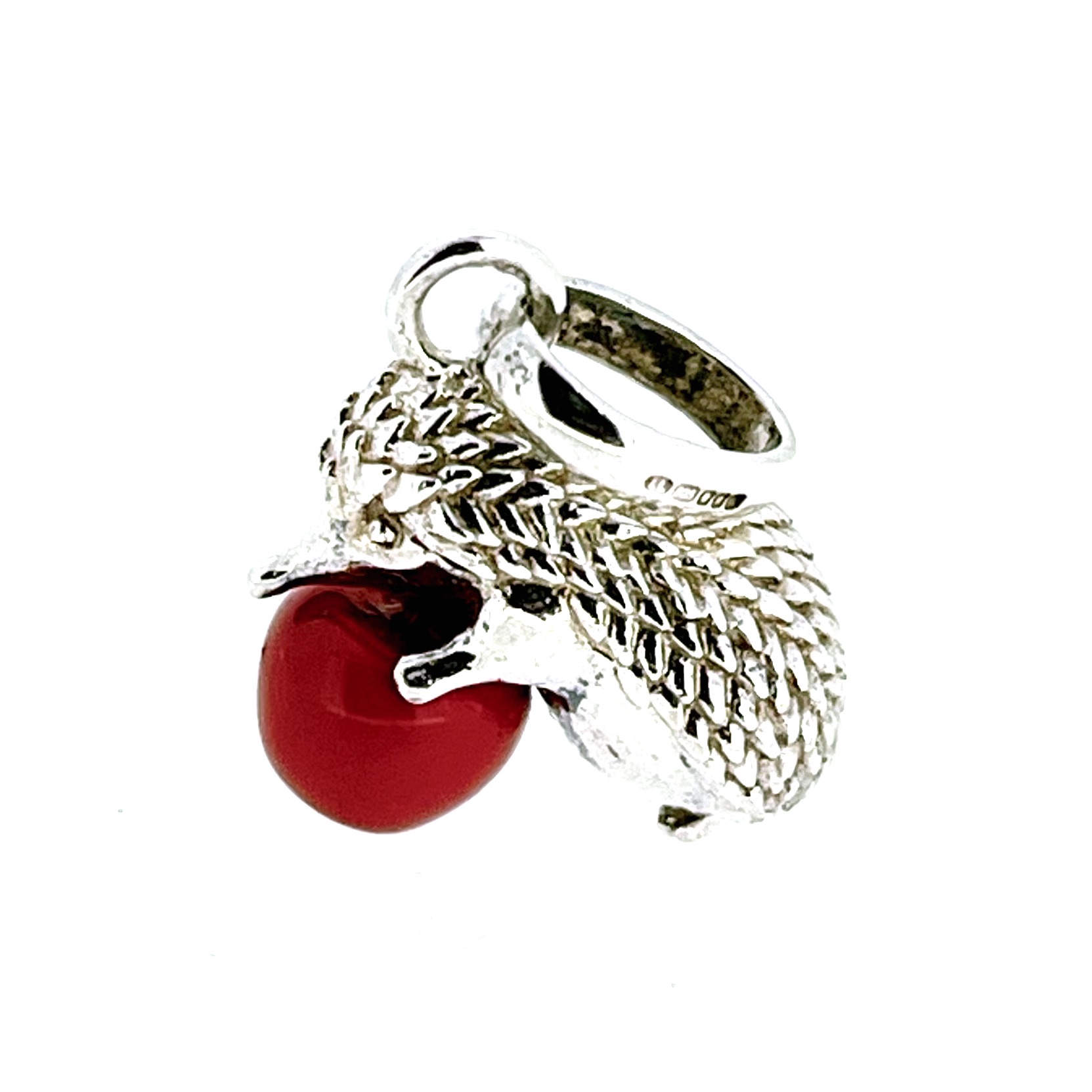This particular example is hallmarked for 2012, but the design was likely produced across multiple seasons. The hedgehog itself measures approximately 14mm long by 10mm wide, and 15mm high (or 18mm including the jump ring). The red enamel apple sits at 7mm wide and is crafted in sterling silver beneath the translucent coating.