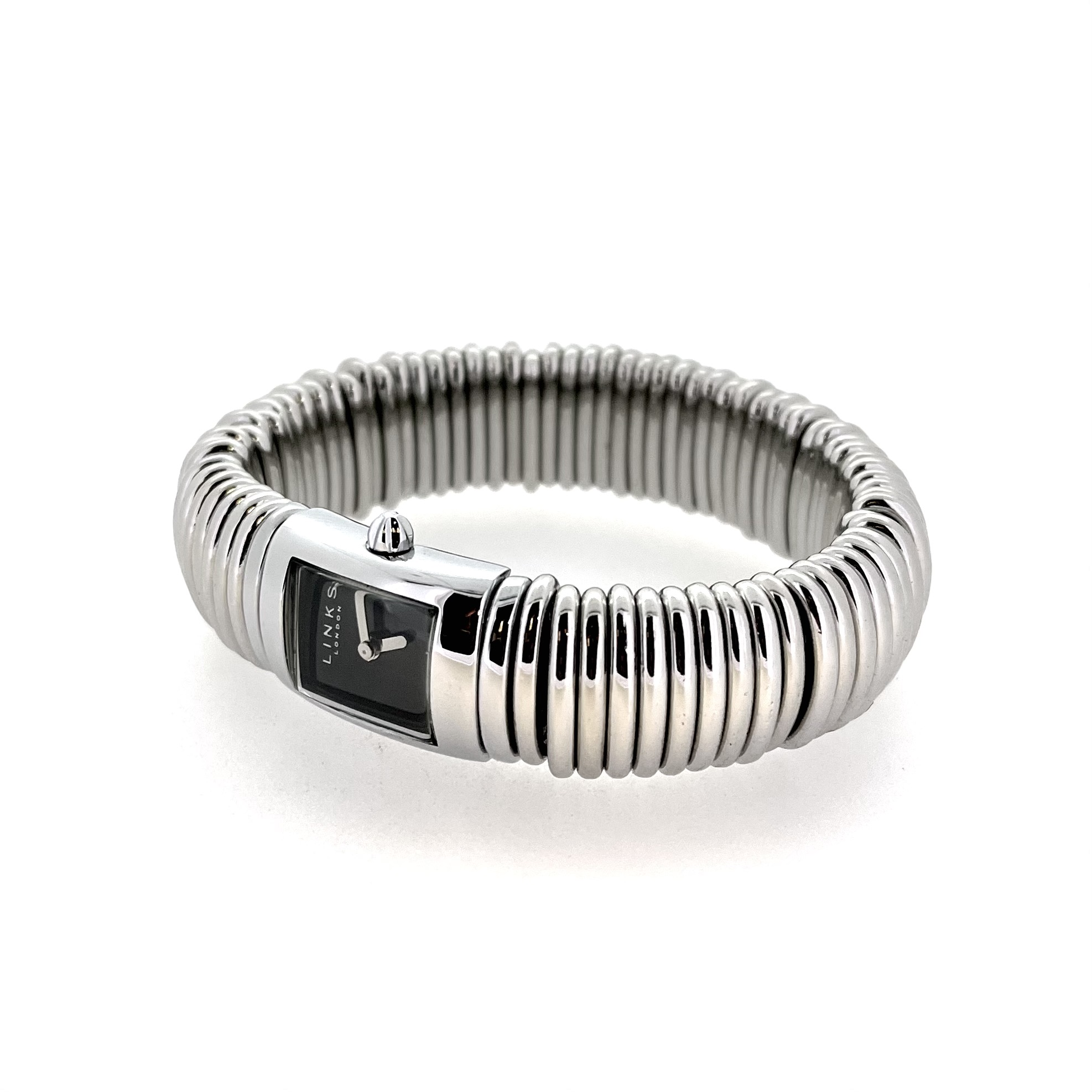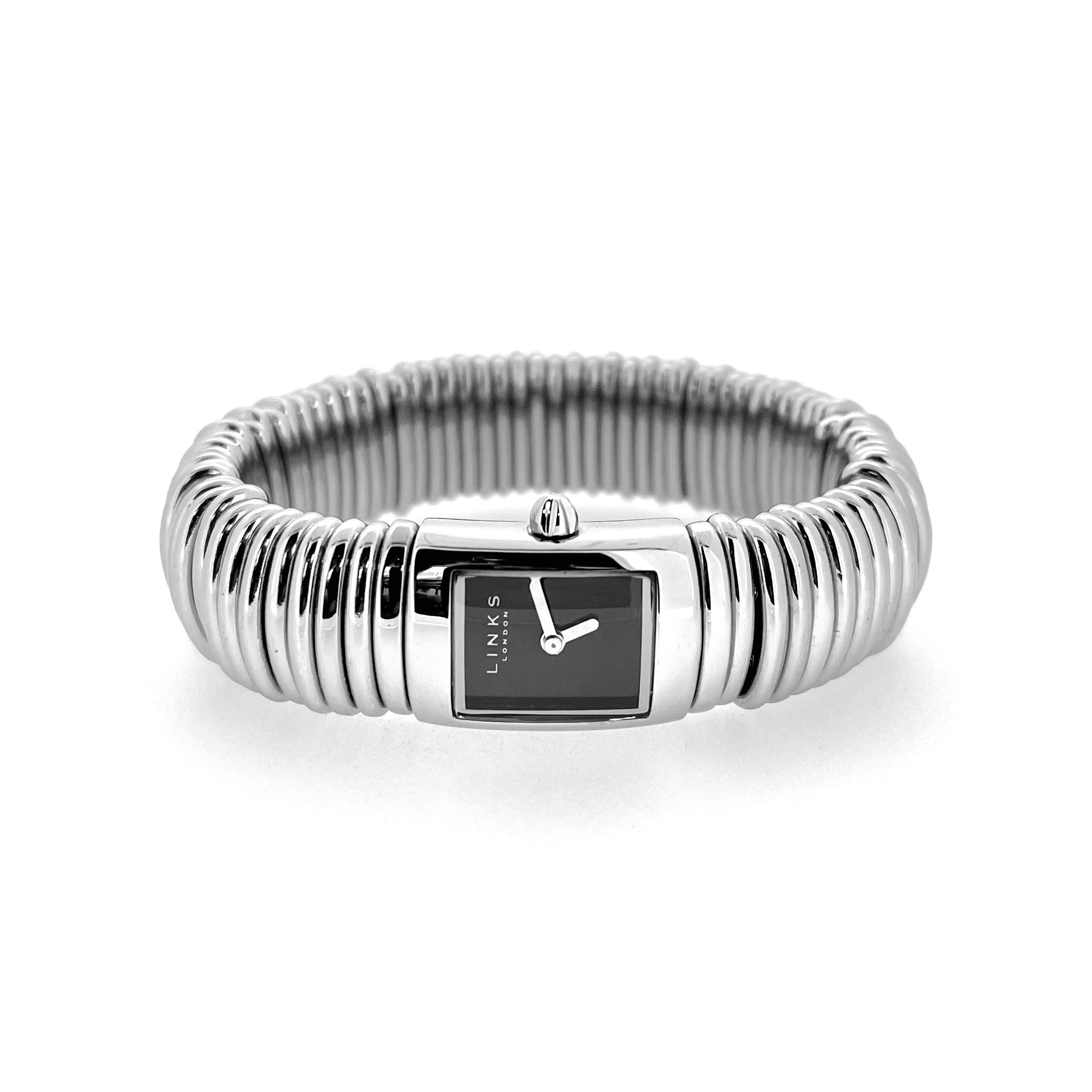 This example, reference 6080.0019 / 0401.0808, features a curved rectangular case crafted in polished stainless steel measuring 24 mm high by 18 mm wide. The black enamel-effect dial bears the minimal LINKS LONDON signature with polished silver baton hands, protected beneath a flat mineral glass crystal. Inside, a dependable Seiko Instruments Hattori PC21S quartz movement ensures precise timekeeping.